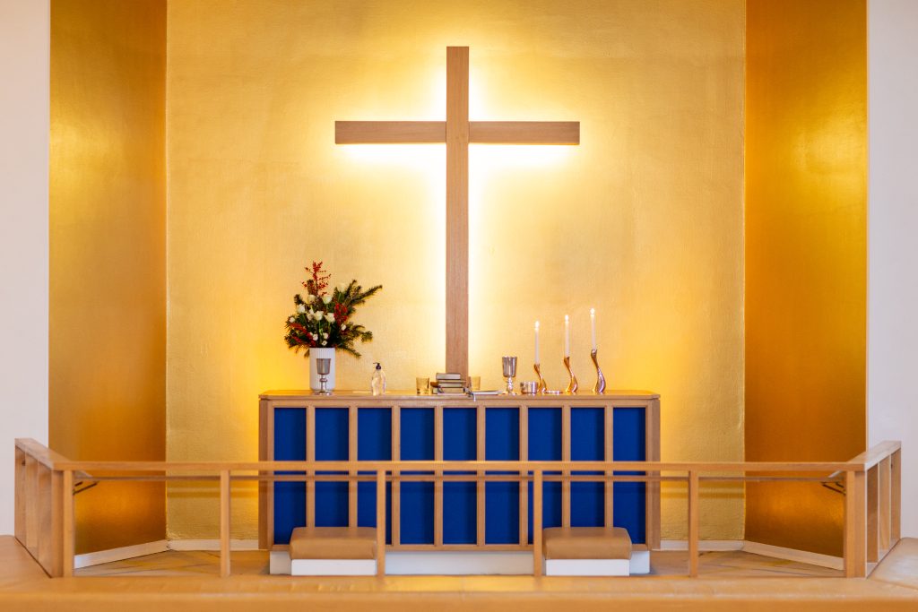 Alterets eneste udsmykning er et helt enkelt kors, som belyses bagfra. Altertæppet fra 1993 er tegnet og vævet af hhv. Ullrich og Mette Lise Rössing i Vrangstrup.