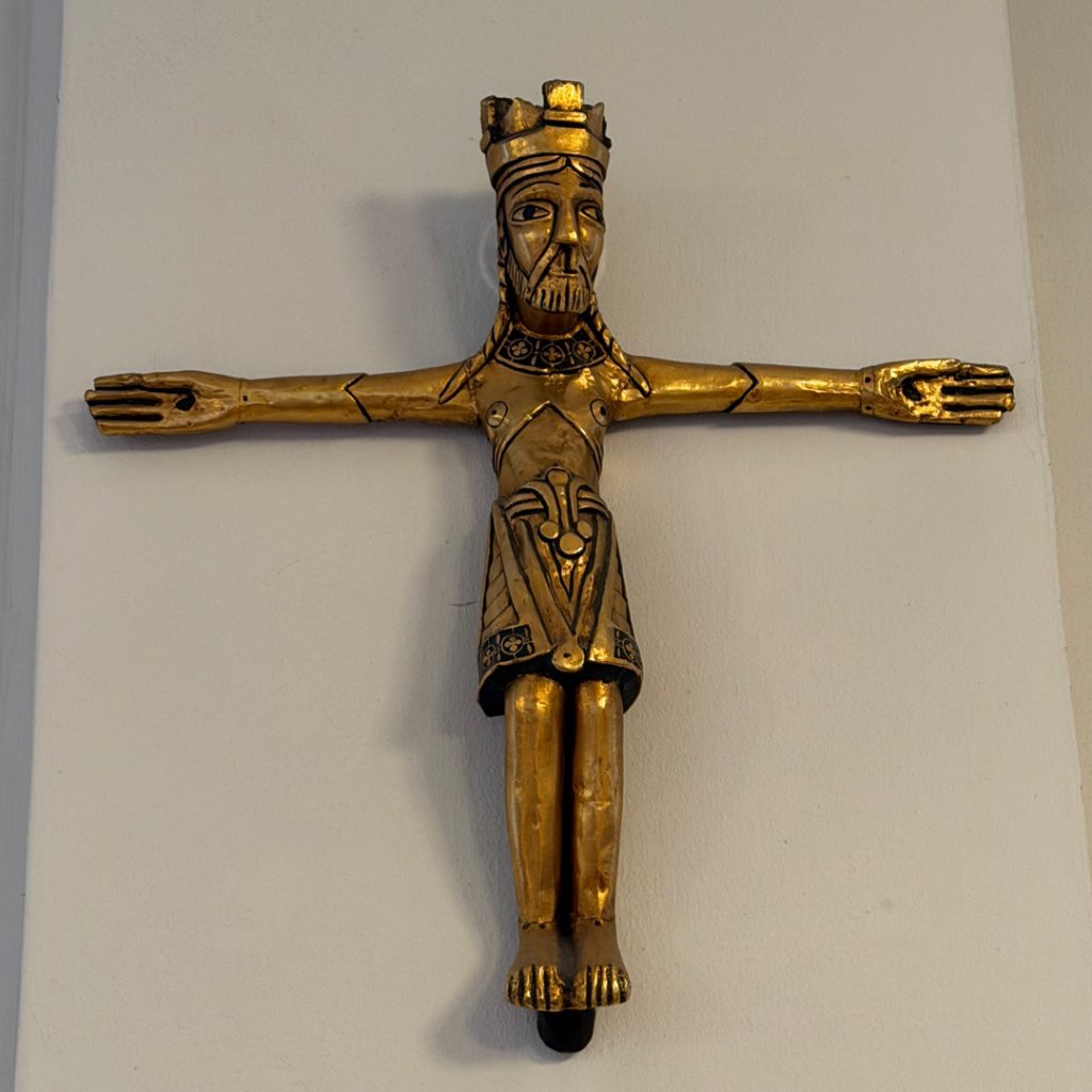 Det gyldne krucifiks, der hænger på væggen overfor indgangen til kirkerummet er en kopi af et af hovedværkerne i Danmarks tidligere middelalderkunst, Aaby-krucifikset, som nu er på Nationalmuseet. Det viser Kristus som den sejrende konge.